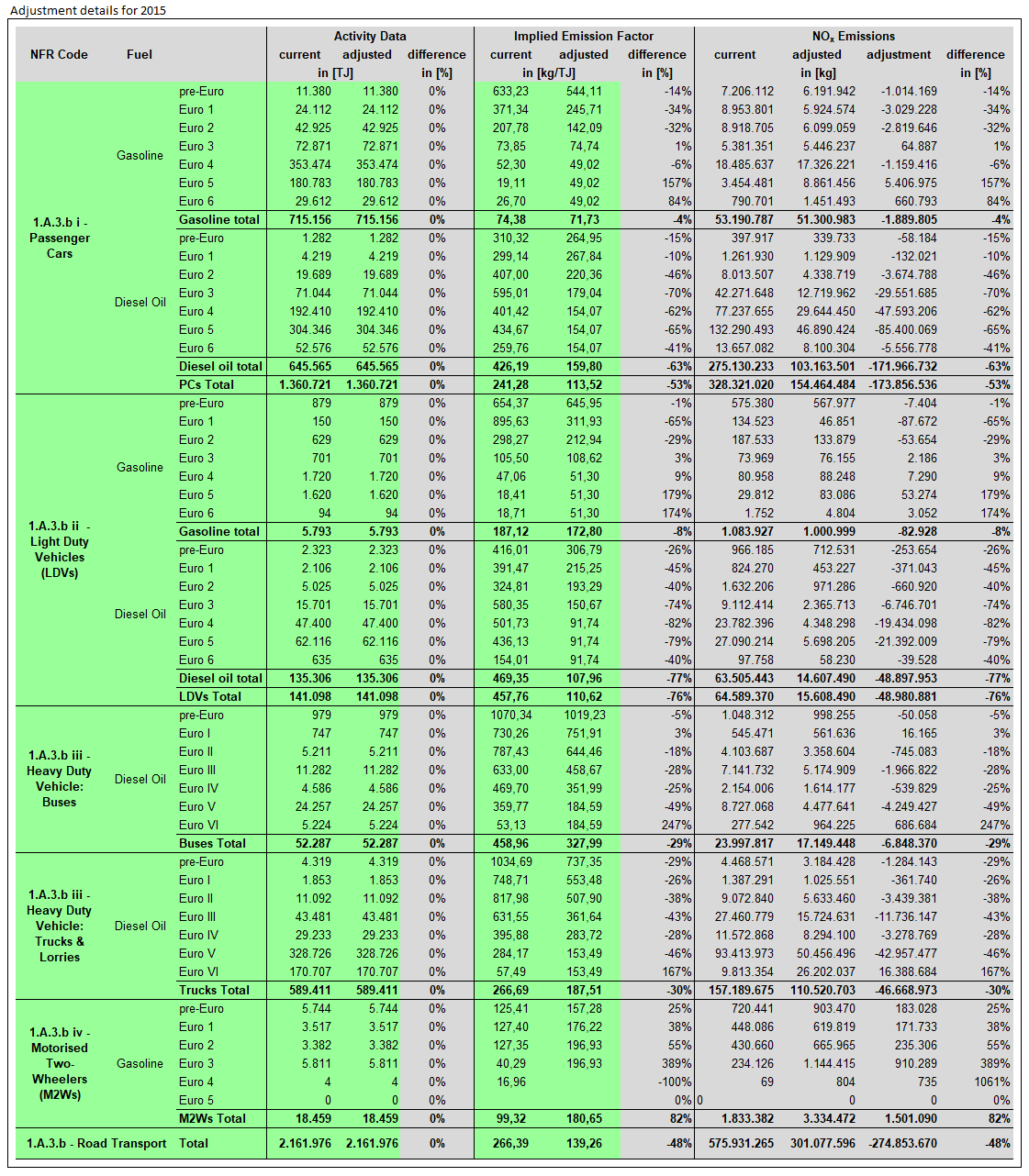 For the formalism of the adjustments, it is difficult to flag whether the modifications for road transport are due to “methodological changes” or due to “changes of emission factor”. Therefore, only the term “change of methodology” will be used (even if at the NFR reporting level this may seem like a simple change in EFs).