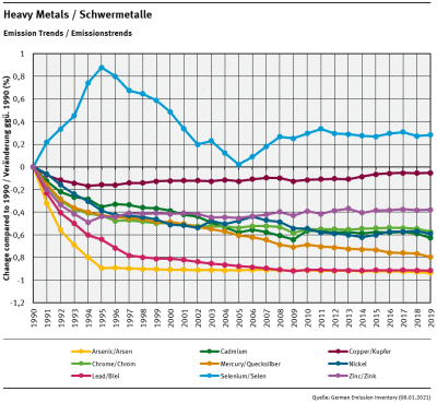 Emission of priority heavy metals (cadmium, lead and mercury) decreased significantly since 1990. Values show reductions by about 58 to 89% compared to the base year. Most of the achievements originate from the early 1990's though. Recent years saw hardly any improvements in heavy metal emissions.