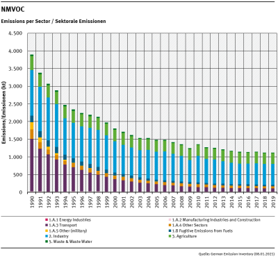NMVOC total emissions show a falling trend from 1990 onwards, with emission reductions of 71,2% between 1990 and 2019 with a bump in 2010 after the dent of 2008 and 2009 due to the economic situation. The last few years show emissions stagnating between 2014 and 2019. The Main Drivers for NMVOC emissions are Fuel Combustion (NFR 1.A) with about half of total 1990 emissions and a 91% reduction between 1990 and 2019. In the Fuel Combustion category, Road Transport (NFR 1.A.3.b) is responsible for about three quarters of the 1990 Fuel Combustion emissions, with Passenger Cars (NFR 1.A.3.b.i) emitting nearly all of it. Reductions of about 94% in those categories between 1990 and 2019 are mainly due to increasingly stricter regulations, especially incentives for automobile users to retrofit/buy cars with catalytic converters. Furthermore the implementation of the Technical Instruction on Air Quality Control (TA-Luft 2002), to decreases in emissions from petrol storage and from fuelling of motor vehicles (1.B.2.a.v) - as a result of implementation of the 20th and 21st Ordinances on the Execution of the Federal Immission Control Act (BImSchV) - and to reduced petrol consumption play a major role in the reduction of NMVOC emissions within the category Fugitive Emissions from fossil fuels (NRF 1.B.2). Substantial emissions also come from Non-Energy Products from Fuels (NFR 2.D), emitting 31% of total 1990 emissions and a 54% reduction between 1990 and 2019.