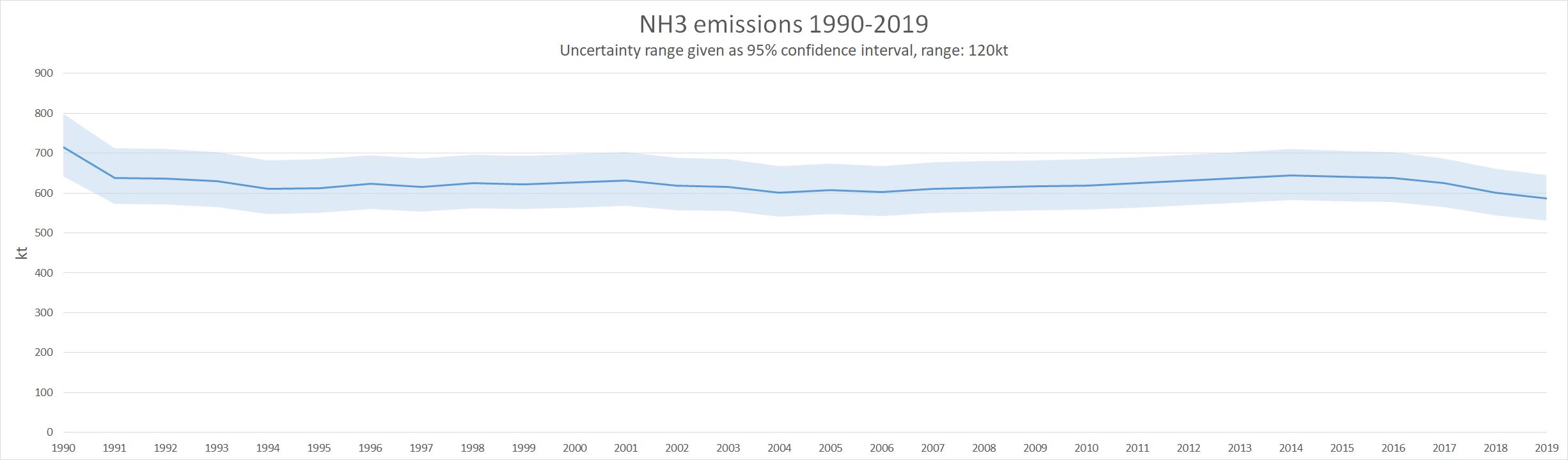 Uncertainty in the NH3 emission national total is moderate and mainly caused by agriculture sources, in particular 3.D.a.2.a - Animal manure applied to soils. 3.B.3 - Manure management - Swine and 3.D.a.1 - Inorganic N-fertilizers do also play significant roles. The national total has a 95% confidence interval of about -9.5% to +9.9% in 2019, which amounts to about 120kt of NH3. You can drive your own analysis with the numbers found in the spreadsheet file attached.