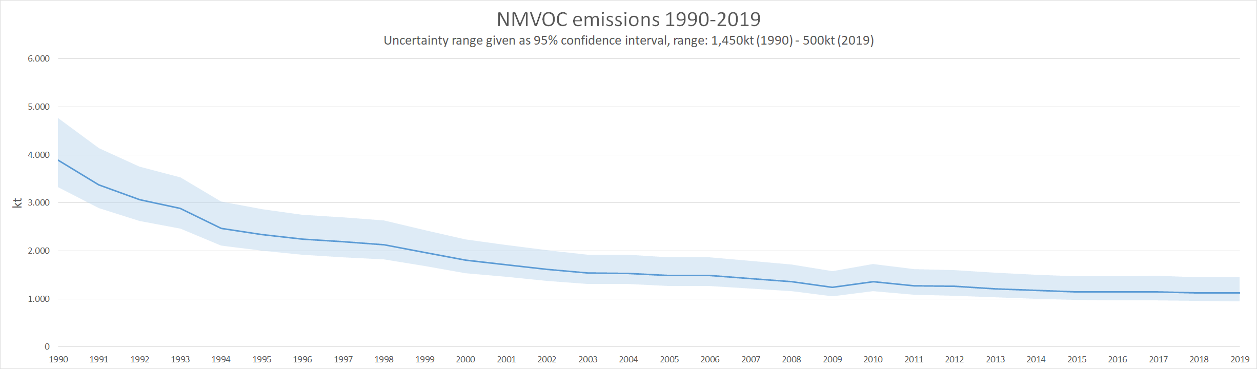 NMVOC emissions and trends are driven by solvent use. While solvent contents of most products are well known, application context and use statistics introduce significant model error bars. Agriculture emissions of NMVOC are, while not very high in value, very uncertain and also contribute to the overall error margins. In sum, NMVOC emissions show moderate to high uncertainty. The national total has a 95% confidence interval of about -15% to +29% in 2019, which amounts to about 500kt of NMVOC. In order of significance, the top five contributors are 3.B - Manure Management - Dairy cattle, 3.B.1.b Manure management - Non-dairy cattle, 2.D.3.a - Domestic Solvent Use, including Fungicides, 1.A.4.b.i - Residential: Stationary Combustion as well as 2.D.3.d - Coating Application. As with the other pollutants, details are to be found in the spreadsheet file.