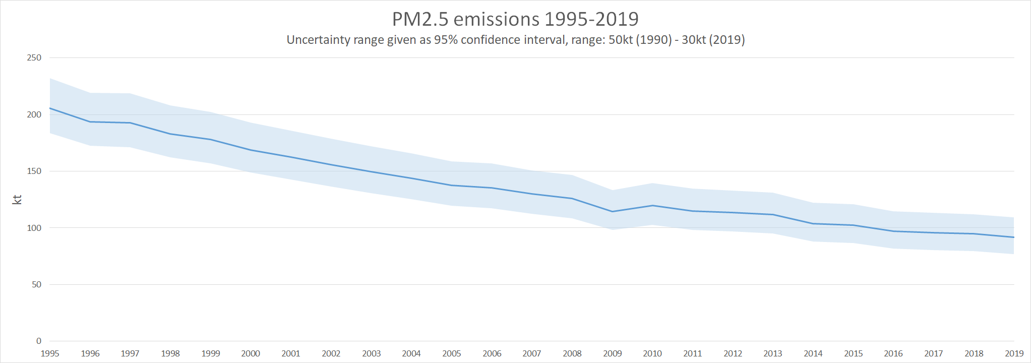 PM2.5 emissions are associated with high uncertainties. The national total has a 95% confidence interval of about -16.5% to +19% in 2019, which amounts to about 30kt of PM2.5. Two sectors contribute the bulk of these errors: 1.A.4.b.i - Residential: Stationary Combustion and 2.L - Other production, consumption, storage, transportation or handling of bulk products. Germany is also one of the few countries that reports abrasion under 1.A.3.c - Transport: Railways, adding noticeably to both emission values and uncertainties. Please refer to the spreadsheet file for details.