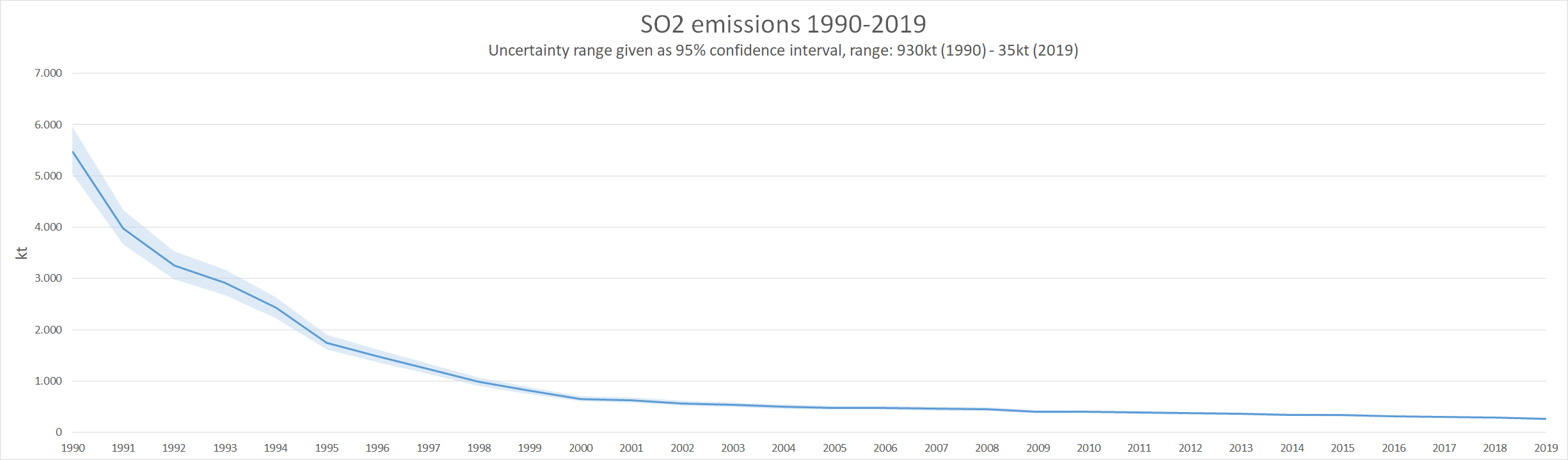 SO2 emissions are mainly emitted by stationary combustion plants. Since those are heavily regulated and fuel sulphur contents are generally well known, uncertainties in SO2 emissions are low. The national total has a 95% confidence interval of about -6.5% to +6.9% in 2019, which amounts to about 35kt of SO2. The top contributing sector to the SO2 uncertainties is 1.A.1.a - Public Electricity And Heat Production, followed by a rather big margin by 1.A.1.b - Petroleum Refining, 1.A.4.b i - Residential: Stationary Combustion, as well as 2.C.1 - Iron and Steel Production. All data is available in the spreadsheet file.