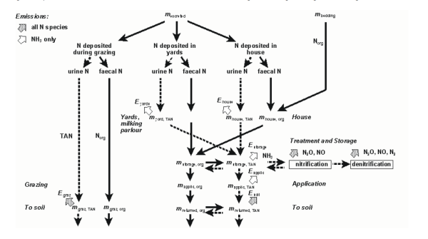 Application of the N mass flow approach requires detailed emission factors for NH3, N2O, NOx and N2 describing the emissions from the various housing and storage systems.