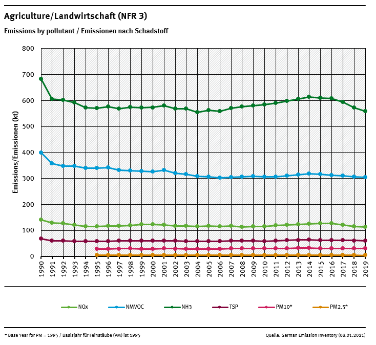 Emissions occurring in the agricultural sector in Germany derive from manure management (NFR 3.B), agricultural soils (NFR 3.D) and agriculture other (NFR 3.I).