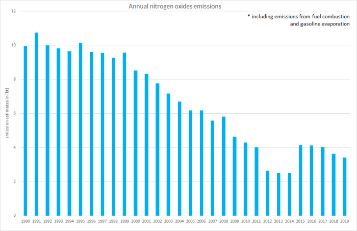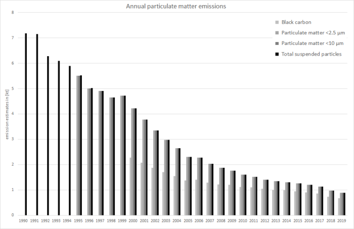 Over-all PM emissions are by far dominated by emissions from diesel oil combustion with the falling trend basically following the decline in fuel consumption between 2000 and 2005. Nonetheless, the decrease of the over-all emission trend was and still is amplified by the expanding use of particle filters especially to eliminate soot emissions.
