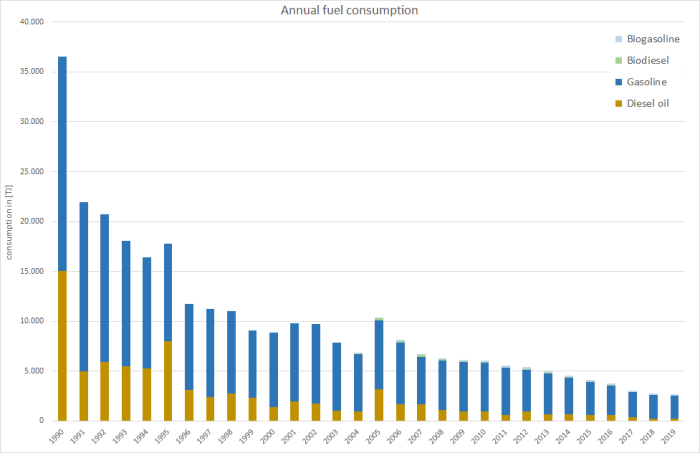For the years as of 1995, the official mineral-oil data of the Federal Republic of Germany (Amtliche Mineralöldaten der Bundesrepublik Deutschland), prepared by the Federal Office of Economics and Export Control (BAFA), are used (BAFA, 2020) 2). Provided in units of [1,000 t], these amounts have to be converted into [TJ] on the basis of the relevant net calorific values given by 3).