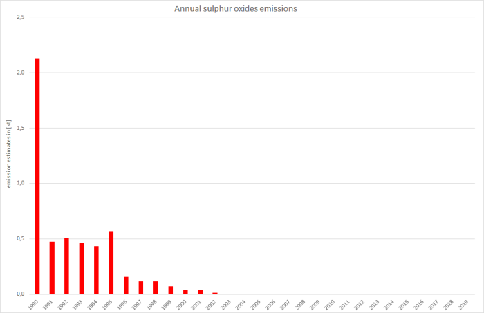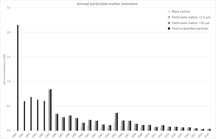 Over-all particulate matter emissions are dominated by emissions from diesel oil combustion with the falling trend basically following the decline in fuel consumption. Here, until 1997, the emission values reported for total suspended particles (TSP) are slightly higher than those reported for PM2.5 and PM10 due to the additional TSP emissions from leaded gasoline that was banned in 1997.