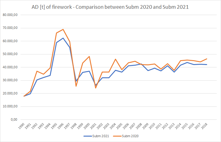 The emissions from As, Cd, Cr, Hg and Ni were deleted. The VPI proofed that these emissions does not occur. For Pb the emissions are from 2003 onwards changed to NA because the VPI proofed that the usage of Pb is forbidden since 2003 by a DIN Norm. The emissions of CO, Cu, NOx, SOₓ, Zn and Pb are changed because of changed AD. The emissions of PM10, PM2.5 and TSP are changed because of changed AD and new EFs from the VPI.