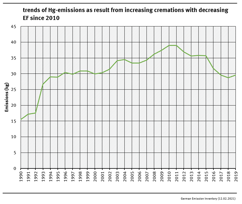 In 2018 the TERT noted that the German Hg EF is 100 times smaller than the default value proposed in the 2016 EMEP/EEA Guidebook and the Cd and Pb EF are 1000 times smaller than the default values proposed in the 2016 EMEP/EEA Guidebook. However, the EF for Pb and Cd are based on national expert judgement: assumption that a) the emissions behave similarly to dust and b) the dust limit value of the air pollution control specification (27th BImSchV) is complied with (to be confirmed on the basis of the new measurement data from 5 crematoria with different exhaust gas cleaning systems). The Hg EF was calculated on the basis of the German report on “OSPAR Recommendation 2003/4 on controlling the dispersal of mercury from crematoria“, but is under evaluation.