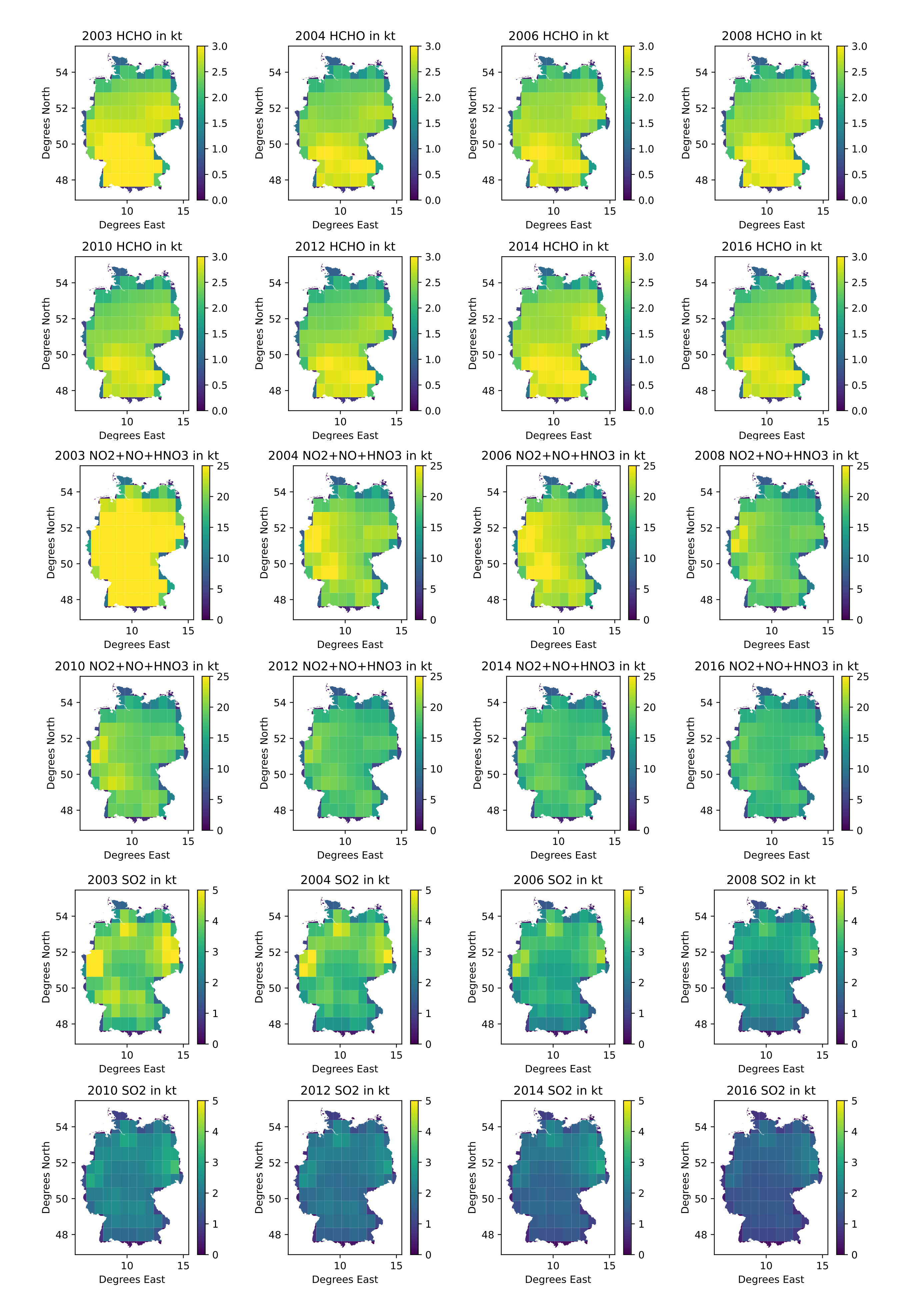 The CAMS global reanalysis data products are available from the ECMWF Atmospheric Composition Reanalysis (EAC4) process. They are available as either daily or monthly (ECMWF, 2022)13) data products in either single, or multi-level variants. More detail on the data products and their generation can be found in (Inness et al., 2019)14). For the verification work presented here the 0.75°x0.75° monthly averaged fields data product was used, which is available for the time-period from 2003 till 06/2021. Therefore, we used the time-period from 2003 until 2020 for comparison to the German inventory data. The update frequency of this monthly dataset is every six months, carried out by the ECMWF. The CAMS monthly dataset offers total column values for the following major air-pollutants (PM10, PM2.5, NO2, SO2 and several species of NMVOC such as HCHO), which were used in the following for a comparison to the national total values for Germany. An example of the monthly data aggregated to the respective year can be seen in figure 1.