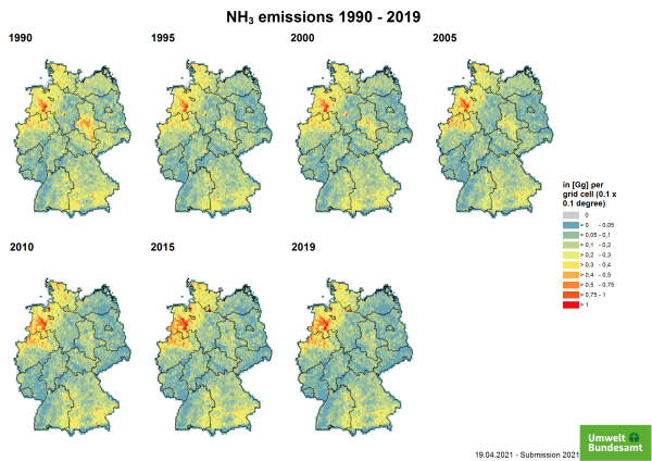 Compared to the above mentioned air pollutants, drastic reduction of ammonia emissions did not occur in the last decades and abatement measures are still a political issue. The highest ammonia emissions occur in rural areas, especially in the north-west of Germany. The emissions from intensive livestock farming (point sources) are clearly visible in the graphics.