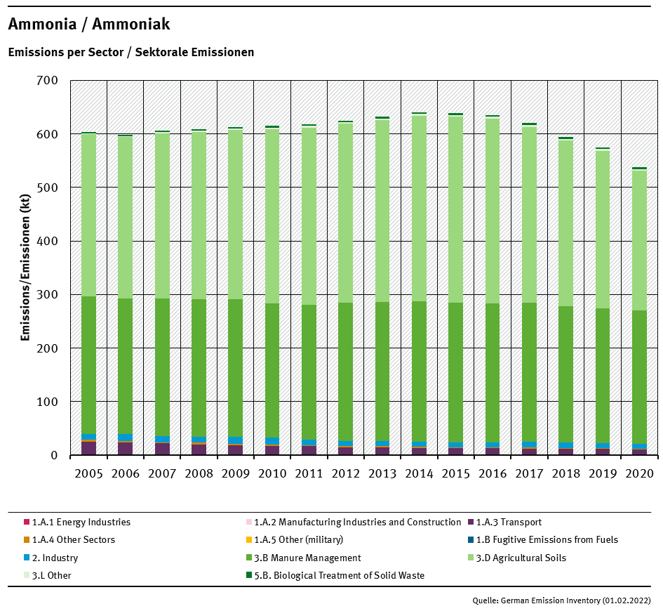 Germany has made a commitment under the Gothenburg Protocol to reduce ammonia emissions. Since 2010, it is no longer permissible to exceed a National Emission Ceiling of 550kt NH₃ for Germany as whole. The revised Gothenburg Protocol and the revised NEC Directive both define emission reduction targets relative to a 2005 base year, mandating 5% (2020) and 29% (2030) reductions respectively.