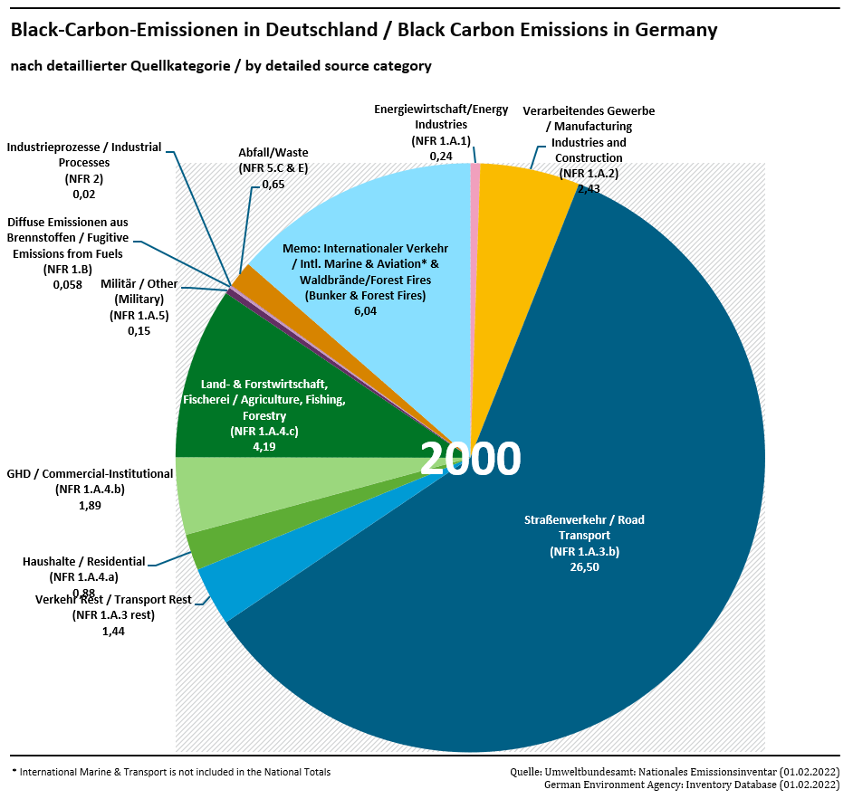 Germany reports Black Carbon (BC) emissions for all years from 2000 onward. The main sources are transport as well as mobile and stationary combustion. Germany uses the EMEP/EEA 2016 Guidebook to estimate BC emissions, augmented by some country specific emission factors, i.e. split factors for the BC portion of PM2.5, in particular in road transport. The following figure provides an overview on the sources and their respective contribution to the German national total.