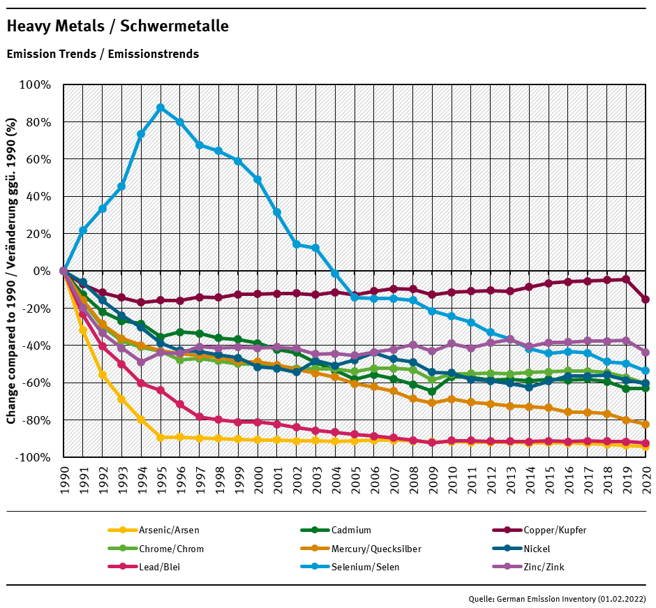 Emission of priority heavy metals (cadmium, lead and mercury) decreased significantly since 1990. Values show reductions by about 58 to 89% compared to the base year. Most of the achievements originate from the early 1990's though. 2019 and 2020 emissions saw a substantial reduction trend for mostmost heavy metals.
