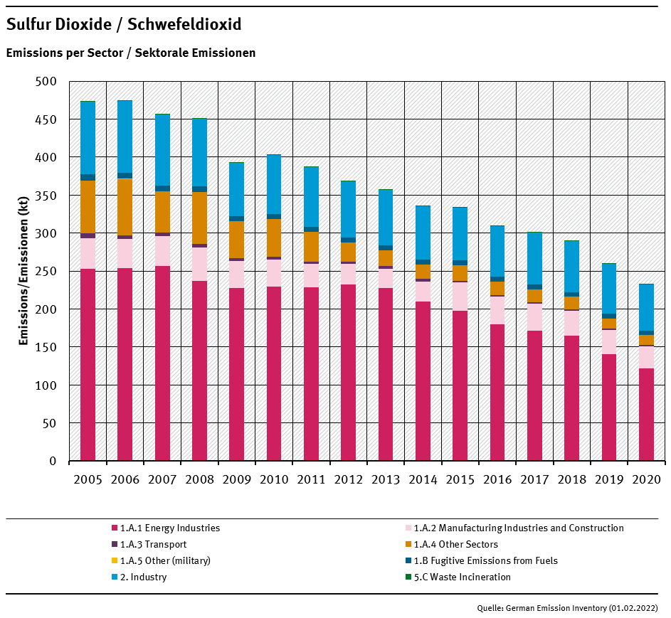 By far the largest proportion of SO₂ is produced by the oxidation of the sulphur contained in the fuels used in combustion processes, Fuel Combustion (NFR 1.A) with a 96% share of total SO₂ emissions in 1990 and a 97% reduction between 1990-2020. In 1990, the biggest source of emissions therein is Public Electricity and Heat Production (NFR 1.A.1.a) with about 60% of the emissions from Fuel Combustion (NFR 1.A). Other sources substantially influencing the SO₂ emission trend are Manufacturing Industries and Construction (NFR 1.A.2) and Other Sectors (NFR 1.A.4, including commercial/institutional and residential sources), each adding about one fifth of 1990 emissions from Fuel Combustion (NFR 1.A). All of these sub-categories show a reduction >95 per cent between 1990 and 2020, due to stricter regulations of West Germany that applied to the New German Länder after the German Reunification and changed the fuel mix from sulphur-rich solid fuels to liquid and gaseous fuels.