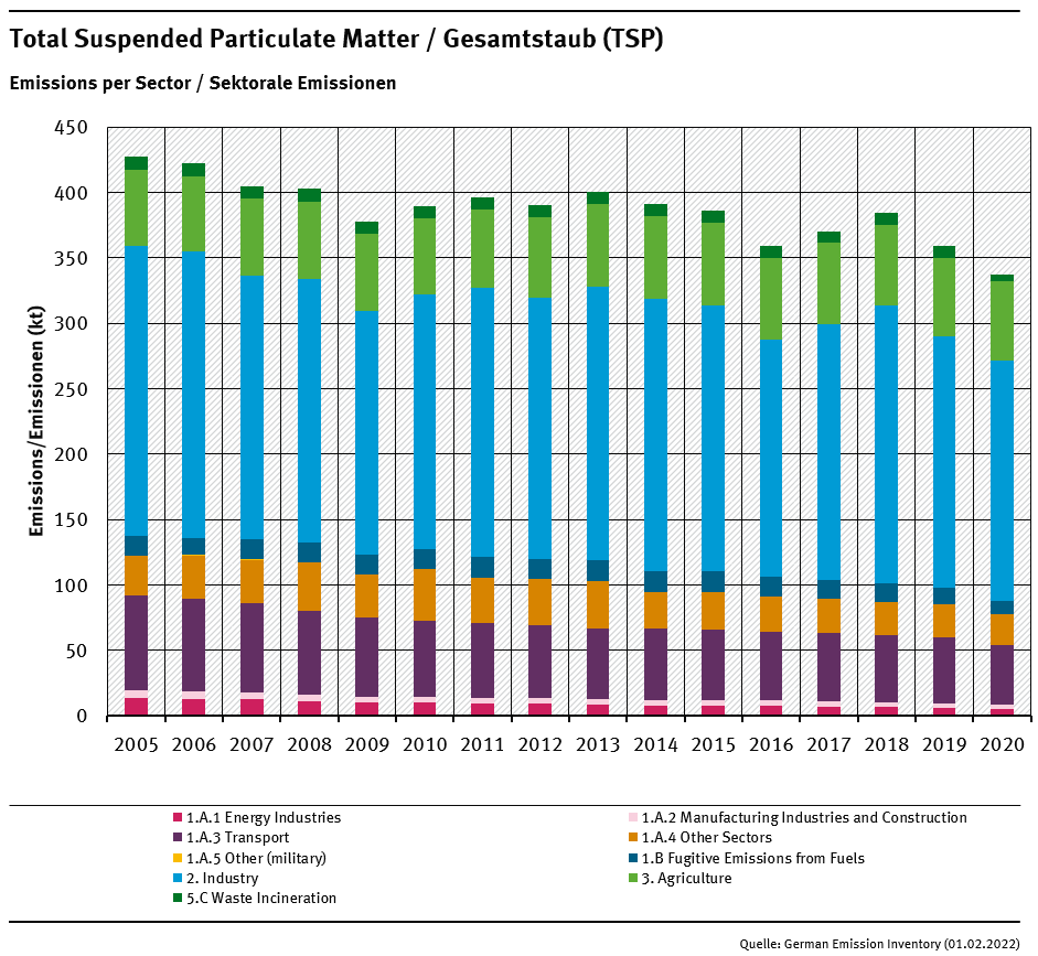 Between 1990 and 2020 the total TSP emissions dropped by 83.5%, due to stricter regulations of the Old West Germany that applied to the New German Länder after the German Reunification and realized a change-over from solid to gaseous and liquid fuel, as well as advancements in filter technologies of combustion plants and industrial processes. The Main Drivers for TSP emissions are Fuel Combustion (NFR 1.A) with 61% of total 1990 emissions and a 94% reduction between 1990 and 2020 and as a sum the Industrial Processes (NFR 2) with 28% of the total 1990 emissions and a 67% reduction between 1990-2020.