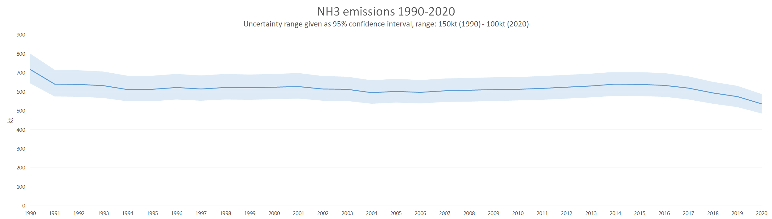 Uncertainty in the NH3 emission national total is moderate and mainly caused by agriculture sources, in particular 3.D.a.2.a - Animal manure applied to soils. 3.B.3 - Manure management - Swine, 3.B - Manure Management - Dairy cattle and 3.D.a.1 - Inorganic N-fertilizers do also play significant roles. The national total has a 95% confidence interval of about -9.4% to +9.7% in 2020, which amounts to about 100kt of NH3. You can drive your own analysis with the numbers found in the spreadsheet file attached.