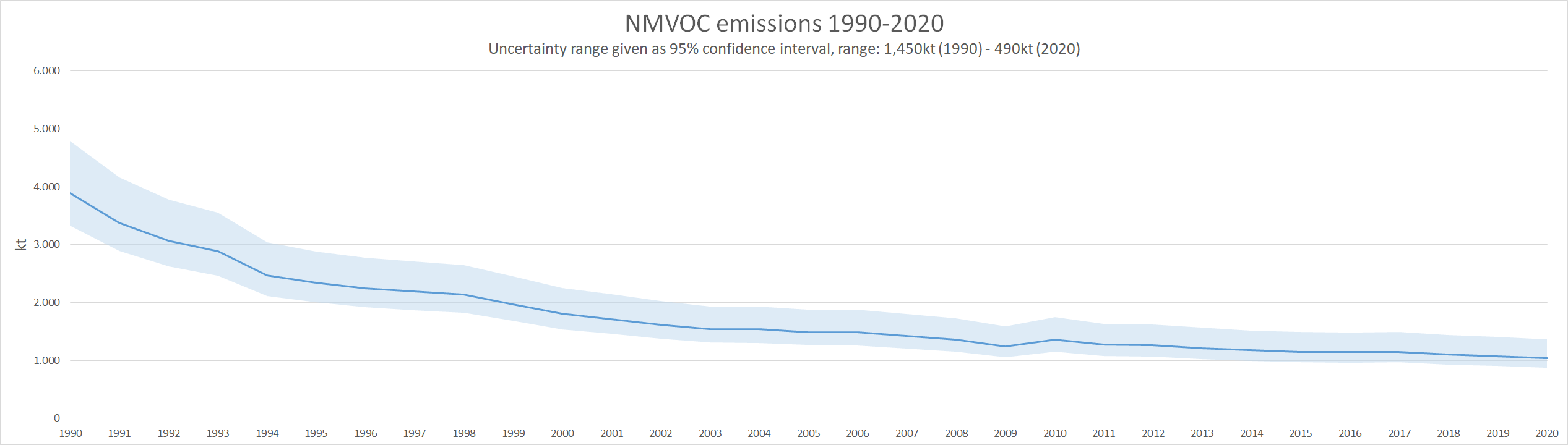 NMVOC emissions and trends are driven by solvent use. While solvent contents of most products are well known, application context and use statistics introduce significant model error bars. Agriculture emissions of NMVOC are, while not very high in value, very uncertain and also contribute to the overall error margins. In sum, NMVOC emissions show moderate to high uncertainty. The national total has a 95% confidence interval of about -15.9% to +31.3% in 2020, which amounts to about 490kt of NMVOC. In order of significance, the top five contributors are 3.B - Manure Management - Dairy cattle, 3.B.1.b Manure management - Non-dairy cattle, 2.D.3.a - Domestic Solvent Use, including Fungicides, 1.A.4.b.i - Residential: Stationary Combustion as well as 2.D.3.d - Coating Application. As with the other pollutants, details are to be found in the spreadsheet file.