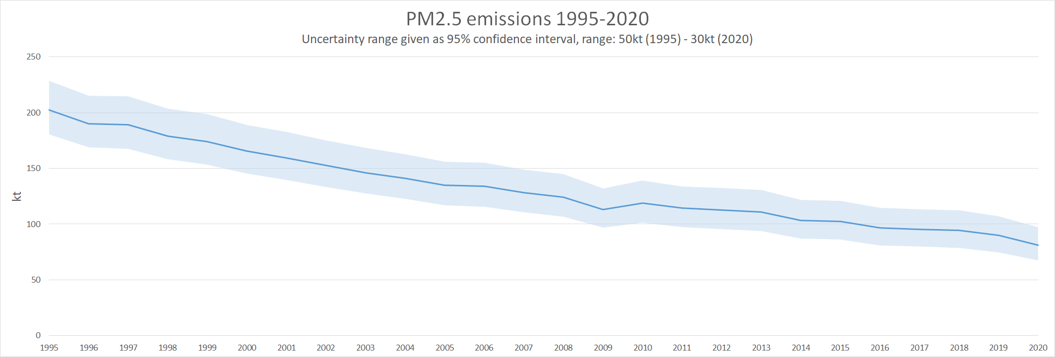 PM2.5 emissions are associated with high uncertainties. The national total has a 95% confidence interval of about -17.1% to +19.6% in 2020, which amounts to about 30kt of PM2.5. Two sectors contribute the bulk of these errors: 1.A.4.b.i - Residential: Stationary Combustion and 2.L - Other production, consumption, storage, transportation or handling of bulk products. Germany is also one of the few countries that reports abrasion under 1.A.3.c - Transport: Railways, adding noticeably to both emission values and uncertainties. Please refer to the spreadsheet file for details.
