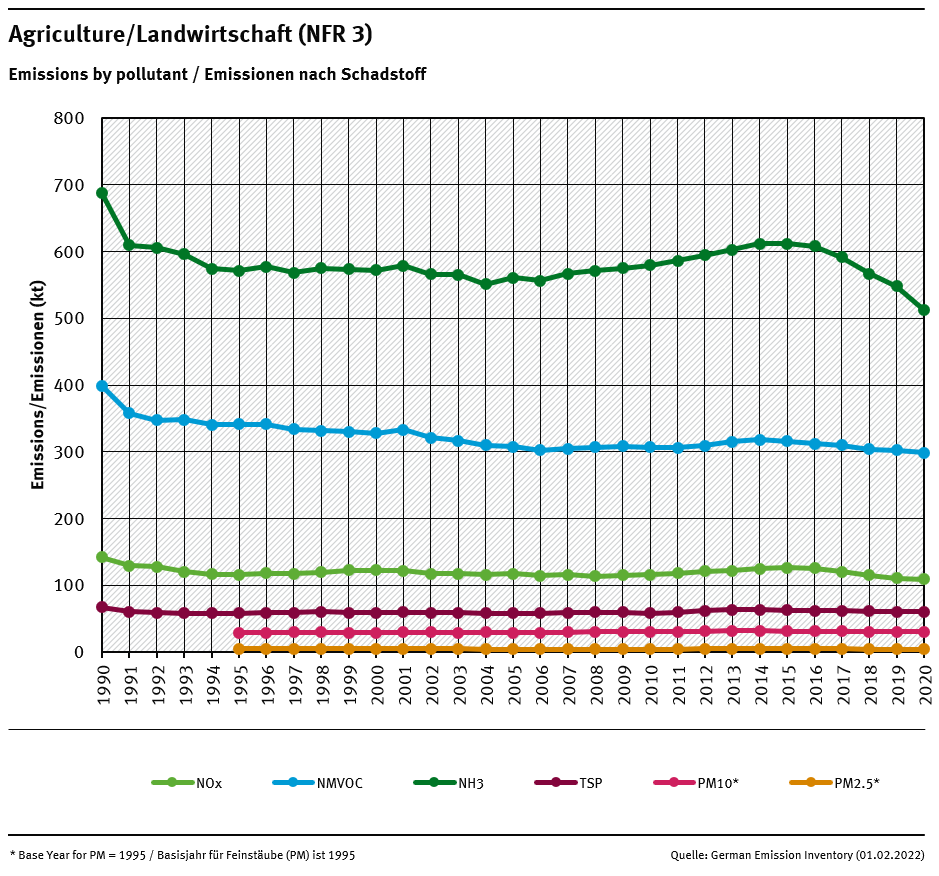 Emissions occurring in the agricultural sector in Germany derive from manure management (NFR 3.B), agricultural soils (NFR 3.D) and agriculture other (NFR 3.I).