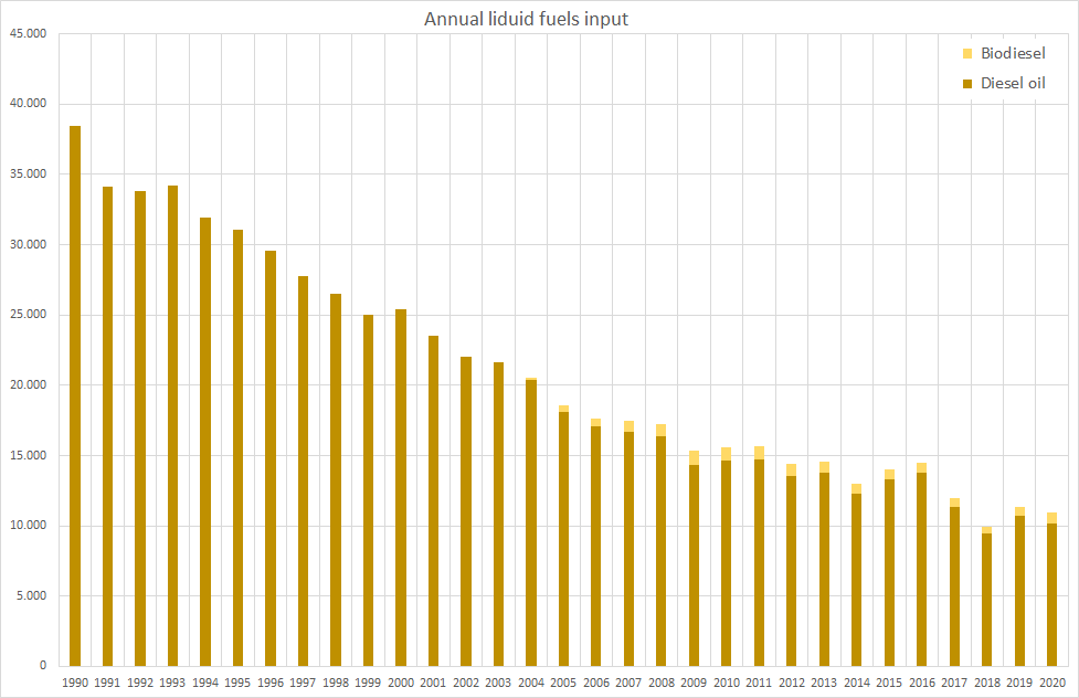 Data on the consumption of biodiesel in railways is provided in the NEBs as well, from 2004 onward. But as the NEBs do not provide a solid time series regarding most recent years, the data used for the inventory is estimated based on the prescribed shares of biodiesel to be added to diesel oil.
