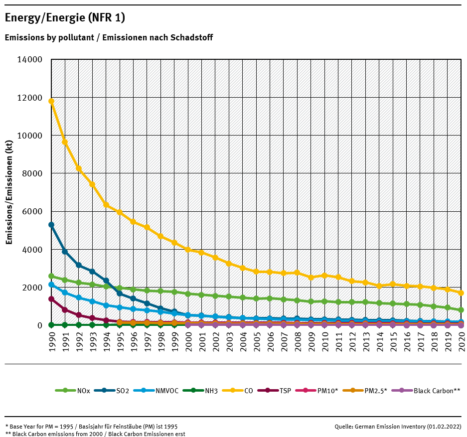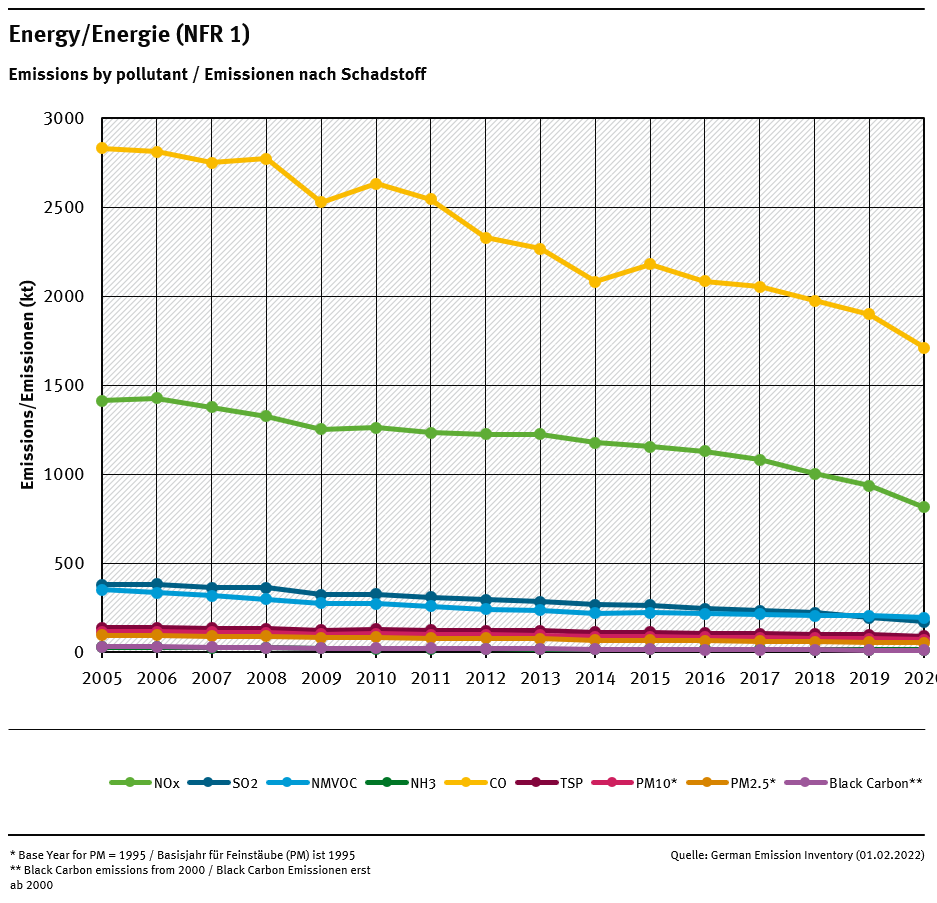 Energy and heat generation constitute the most important sources of emissions in Germany. This holds true for almost every pollutant (a prominent exception of this rule being ammonia, mainly from agriculture). Consequently, this section will look into the sub-sectors making up the NFR 1 - Energy sector with great detail. For overview information on key activity statistics and the basis for fuel based estimates please refer to Chapter 1.4 - Methods and Data Sources.