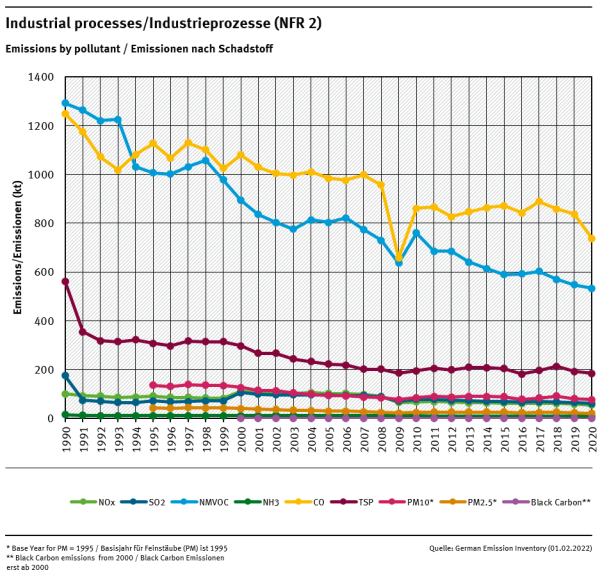 Industrial processes are an important emission source for most pollutants. Due to Germany's high-level, differentiated industry featuring numerous companies and a large number of plants for each sector, emission estimation for industrial processes is very complex. Please refer to the sub-sections below for details.