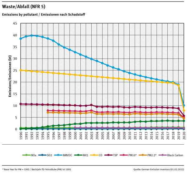 Source category NFR 5 - Waste is not a key source. NMVOC and PM2.5 emissions from Solid Waste Disposal on Land, NH3 emissions from Composting and Anaerobic Digestion at biogas facilities, emissions from Cremation as well as NMVOC emissions from Domestic & Commercial and Industrial Wastewater Treatment are reported.