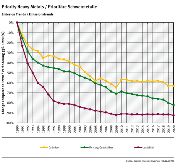 Nevertheless, the above figure also illustrates the fact that for certain pollutants (namely ammonia, sulphur dioxide, and total suspended particles) only moderate progress can be observed since 2000. This particularly holds true for the development of ammonia, where recent years saw steady or even increasing emissions. For heavy metal and POP (Persistent Organic Pollutants) emissions, the picture is less clear. While the release of these substances generally declined, some trends appear to be less favourable. Generally, data completeness and inventory compatibility remains an issue for these pollutants. For the three priority heavy metals cadmium, mercury, and lead, however, very significant reductions have been achieved in the 1990s (see figure below).