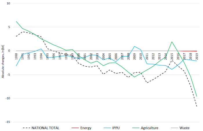 Changes within the National Total reported for 2019 (-11.7 kt | -2 %) result mainly from several larger revisions in NFR 3 (-9.6 kt) together with less significant changes troughout NFRs 1, 2 and 5.
