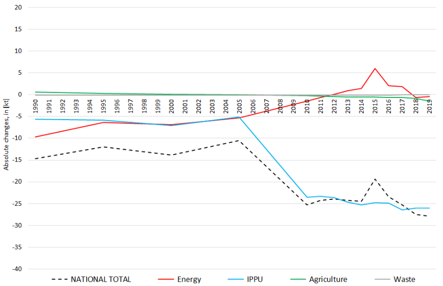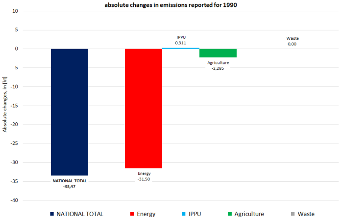 The changes within the National Total reported for 1990 (-34 kt | -1.19 %) are dominated by changes in NFRs 1.A.3.b i, 1.A.3.b ii and 1.A.3.b iii together with less significant revisions throughout NFRs 1, 2 and 3.