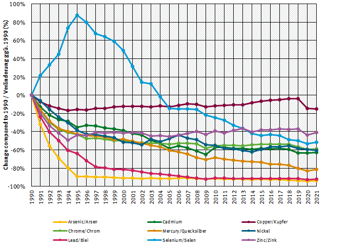 Emission of priority heavy metals (cadmium, lead and mercury) decreased significantly since 1990. Values show reductions by about 58 to 89% compared to the base year, with most of the achievements originating from the early 1990's though.