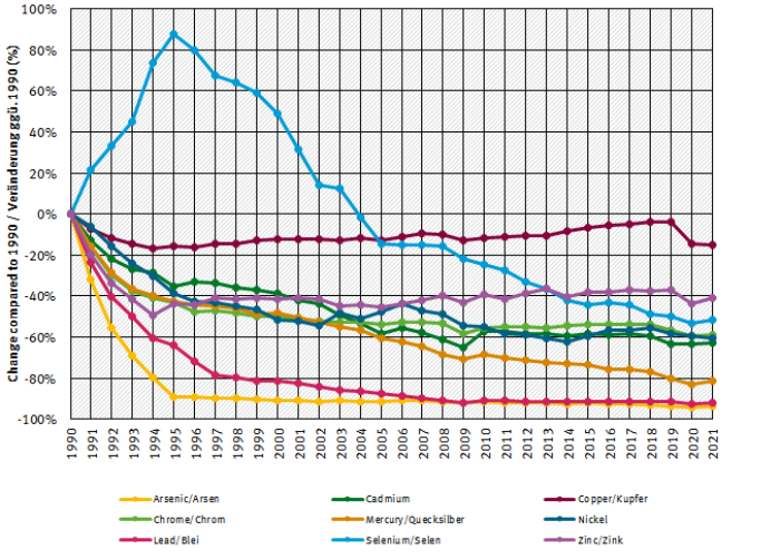 Emission of priority heavy metals (cadmium, lead and mercury) decreased significantly since 1990. Values show reductions by about 58 to 89% compared to the base year, with most of the achievements originating from the early 1990's though.