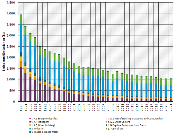 NMVOC total emissions show a falling trend from 1990 onwards, with emission reductions of 73.6% between 1990 and 2021 with a bump in 2010 after the dent of 2008 and 2009 due to the economic situation. After a period of stagnating emissions, The last few years show a slight yearly emission reduction of 3% on average.