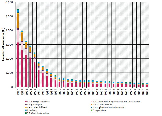 All of these sub-categories show a reduction >95 per cent between 1990 and 2021, due to stricter regulations of West Germany that applied to the New German Länder after the German Reunification and changed the fuel mix from sulphur-rich solid fuels to liquid and gaseous fuels.