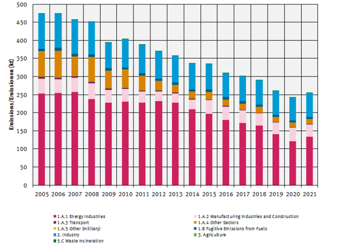 All of these sub-categories show a reduction >95 per cent between 1990 and 2021, due to stricter regulations of West Germany that applied to the New German Länder after the German Reunification and changed the fuel mix from sulphur-rich solid fuels to liquid and gaseous fuels.