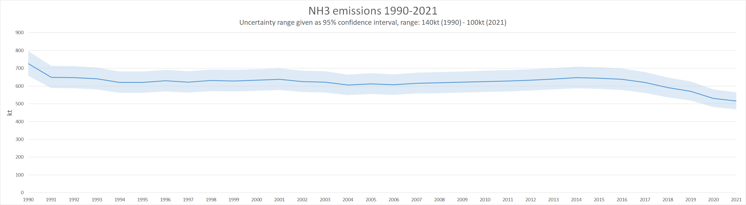 Uncertainty in the NH3 emission national total is moderate and mainly caused by agriculture sources, in particular 3.D.a.2.a - Animal manure applied to soils. 3.B.3 - Manure management - Swine, 3.B - Manure Management - Dairy cattle and 3.D.a.1 - Inorganic N-fertilizers do also play significant roles. The national total has a 95% confidence interval of about -9.2% to +9.6% in 2021, which amounts to about 100kt of NH3. You can drive your own analysis with the numbers found in the spreadsheet file attached.