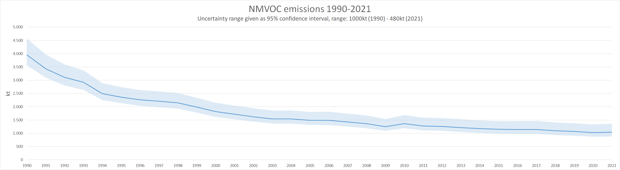 NMVOC emissions and trends are driven by solvent use. While solvent contents of most products are well known, application context and use statistics introduce significant model error bars. Agriculture emissions of NMVOC are, while not very high in value, very uncertain and also contribute to the overall error margins. In sum, NMVOC emissions show moderate to high uncertainty. The national total has a 95% confidence interval of about -15.5% to +30.3% in 2021, which amounts to about 480kt of NMVOC. In order of significance, the top five contributors are 3.B - Manure Management - Dairy cattle, 3.B.1.b Manure management - Non-dairy cattle, 2.D.3.a - Domestic Solvent Use, including Fungicides, 1.A.4.b.i - Residential: Stationary Combustion as well as 2.D.3.d - Coating Application. As with the other pollutants, details are to be found in the spreadsheet file.