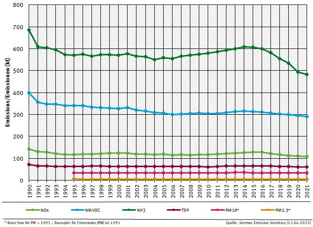 In 2019 the agricultural sector emitted 557.8 Gg of NH3, 112.2 Gg of NOx, 304.4 Gg of NMVOC, 60.3 Gg of TSP, 30.4 Gg of PM10 and 4,4 Gg of PM2.5 and 8.8 kg HCB. The trend from 1990 onwards is shown in the graph below. The sharp decrease of emissions from 1990 to 1991 is due to a reduction of livestock population in the New Länder (former GDR) following the German reunification. The increase of NH3 emissions since 2005 is mostly due to the expansion of anaerobic digestion of energy crops, especially the application of the digestion residues. This is a new emission source which also effects NOx emissions. However, these emissions are excluded from emission accounting by adjustment, as they are not part of the NEC and Gothenburg commitments. The decrease of NH3 emissions since 2015 is mostly due to a decline in the amounts of mineral fertilizer sold. Further details concerning trends can be found in Rösemann et al., 2021, Chapter 2.