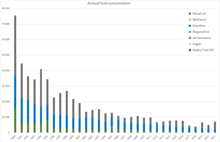 As the “consumption data” provided here originally represents fuel delivery data, some trends in “annual consumption” are influenced by stock-keeping activities. Here, a clear impact of storage effects can be observed for avgas, where a significantly high amount of 15 TJ was purchased in 2007 followed by zero or very small deliveries.