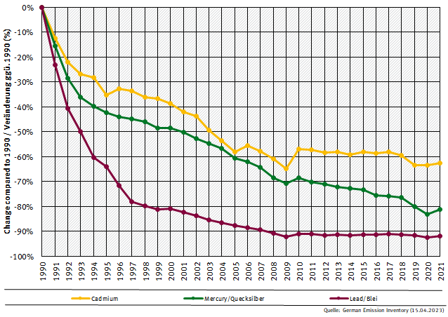 Nevertheless, the above figure also illustrates the fact that for certain pollutants (namely ammonia, sulphur dioxide, and total suspended particles) only moderate progress can be observed since 2000. This particularly holds true for the development of ammonia, where recent years saw steady or even increasing emissions. For heavy metal and POP (Persistent Organic Pollutants) emissions, the picture is less clear. While the release of these substances generally declined, some trends appear to be less favourable. Generally, data completeness and inventory compatibility remains an issue for these pollutants. For the three priority heavy metals cadmium, mercury, and lead, however, very significant reductions have been achieved in the 1990s (see figure below).