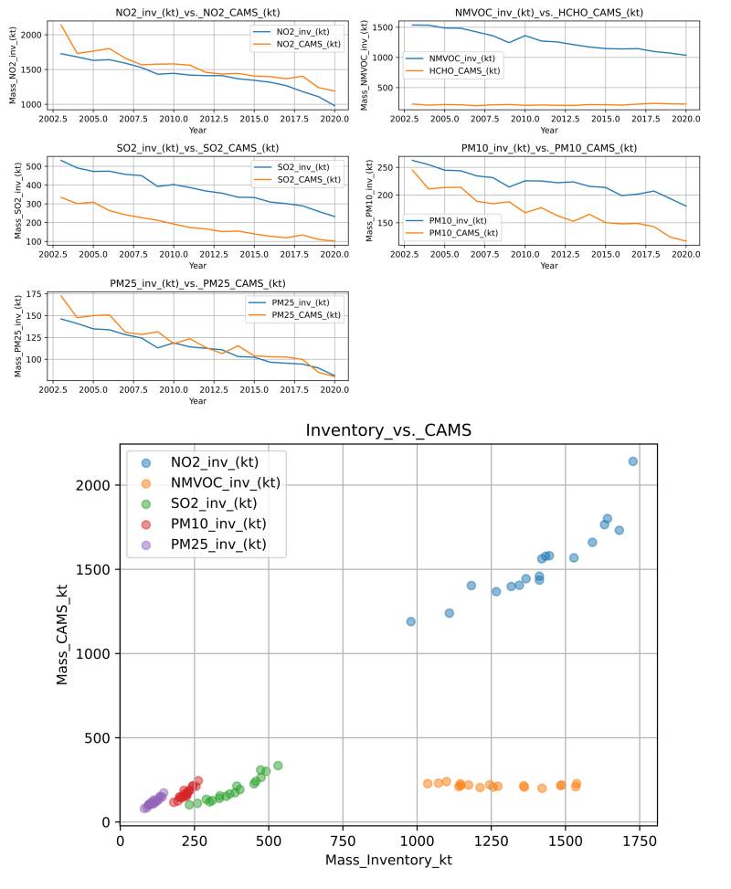 The CAMS global reanalysis data products are available from the ECMWF Atmospheric Composition Reanalysis (EAC4) process. They are available as either daily or monthly (ECMWF, 2022)13) data products in either single, or multi-level variants. More detail on the data products and their generation can be found in (Inness et al., 2019)14). For the verification work presented here the 0.75°x0.75° monthly averaged fields data product was used, which is available for the time-period from 2003 till 06/2021. Therefore, we used the time-period from 2003 until 2020 for comparison to the German inventory data. The update frequency of this monthly dataset is every six months, carried out by the ECMWF. The CAMS monthly dataset offers total column values for the following major air-pollutants (PM10, PM2.5, NO2, SO2 and several species of NMVOC such as HCHO), which were used in the following for a comparison to the national total values for Germany. An example of the monthly data aggregated to the respective year can be seen in figure 1.