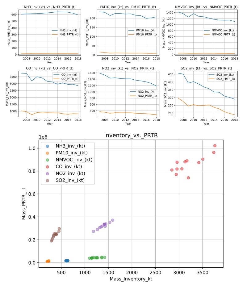 Time series data from all the four datasets are compared to the reported national inventory data time series on the basis of the national totals for Germany. This is done in a visual-quantitative way using plots of the time series data of the national totals, as well as scatter plots between the reported national totals and each of the four sets of data. In addition a quantitative analysis in form of correlation is carried out using standard mathematical similarity operators such as the Pearson and Spearman-Rank correlations, which are widely used to compute similarity between two mathematical vectors. The overall goal is to offer a semi-quantitative and qualitative comparison between the reported national totals of air pollution species and the independent datasets using time-series data. A direct sector-based comparison has not been considered, yet, as only EDGAR and PRTR data would offer a sectoral disaggregation of the national total data.