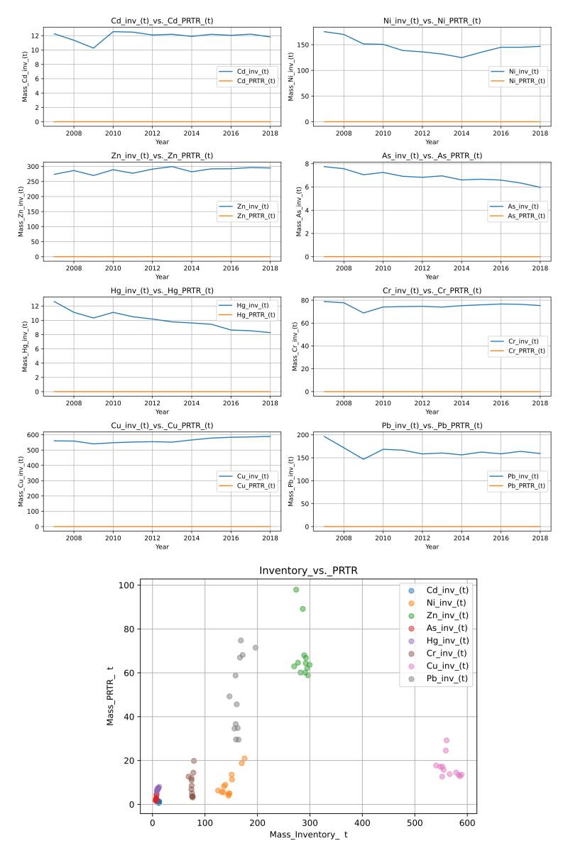 The first recommended dataset is the air-pollution (AP) dataset of the Emission Database for Global Atmospheric Research (EDGAR) of the JRC (Crippa et al., 2019)2), which is a worldwide gold standard source of data for global and local air-quality modelling. It contains standard air-pollutants, such as NO2 or NMVOC. Data for several heavy metals species are, however, missing in this dataset. The second source of data is the mass median data for the German data from the European moss survey (Schröder and Nickel, 2019)3), which is also part of the monitoring carried out at the Umweltbundesamt in Germany. Here the median of the mass fraction in moss for each heavy metal species is compared to the reported inventory data. The third dataset used is the Pollution Release and Transfer Register (PRTR) (Umweltbundesamt, 2022)4). Details for the PRTR data, as well as the database may be found under: https://thru.de/thrude/. Here analysis has been split into two parts, first the heavy metal air-pollutants and secondly the ordinary air-pollutants, due to their different mass in the reporting tables.