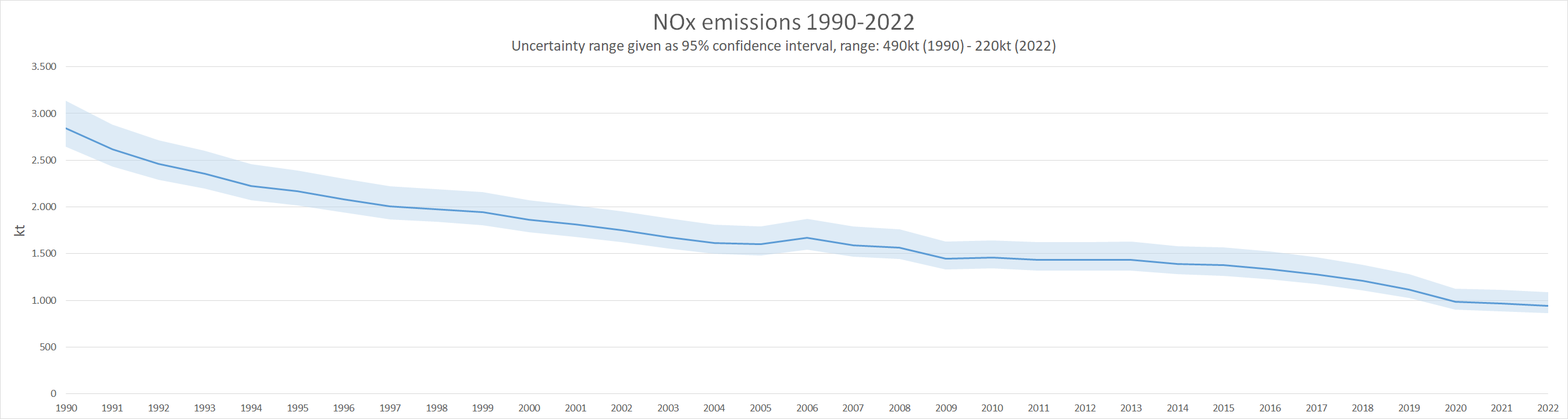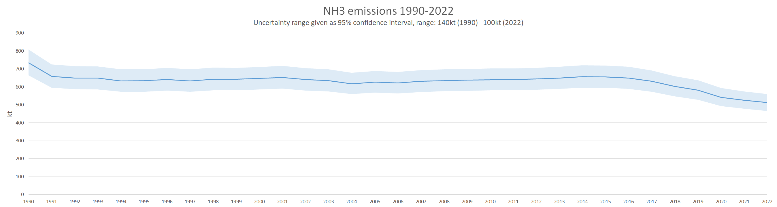 Uncertainty in the NH3 emission national total is moderate and mainly caused by agriculture sources, in particular 3.D.a.2.a - Animal manure applied to soils. 3.B.3 - Manure management - Swine, 3.B - Manure Management - Dairy cattle and 3.D.a.1 - Inorganic N-fertilizers do also play significant roles. The national total has a 95% confidence interval of about -9.1% to +9.4% in 2022, which amounts to about 100kt of NH3. You can drive your own analysis with the numbers found in the spreadsheet file attached.