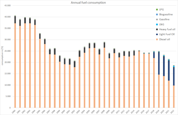 Here, the annual fuel consumption for domestic maritime navigation are modelled within 2) based on AIS data and deduced from NEB lines 6 and 64 respectively, depending on whether or not a certain ship is registered by the International Maritime Organization (IMO). Here, fuels consumed by large, IMO-registered and sea-going ships and vessels are included in NEB line 6 whereas fuels consumed by smaller ships without IMO-registration are included in NEB line 64. After these deductions, the amounts of fuels remaining in NEB 64 are allocated to domestic inland navigation.