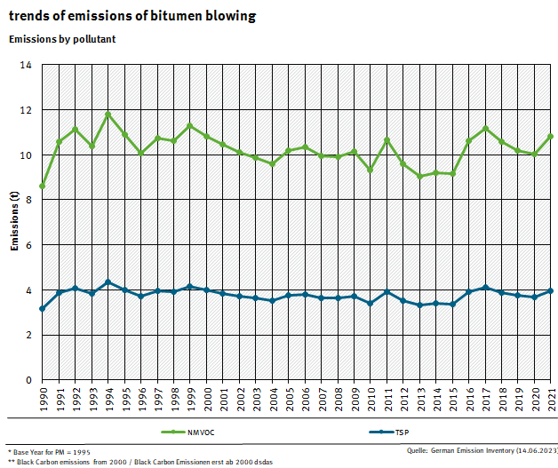 The NMVOC and PAH emissions that result from bitumen blowing are calculated with an emission factor derived from the uncontrolled standard emission factor of the GB 2023 taking account of the maximum permitted levels and reduction-measures requirements specified in the Technical Instructions on Air Quality Control (TA Luft). The emission factors for Cd, Cr and Ni were taken from real measurements with an increased safety factor (maximum or ten-fold).