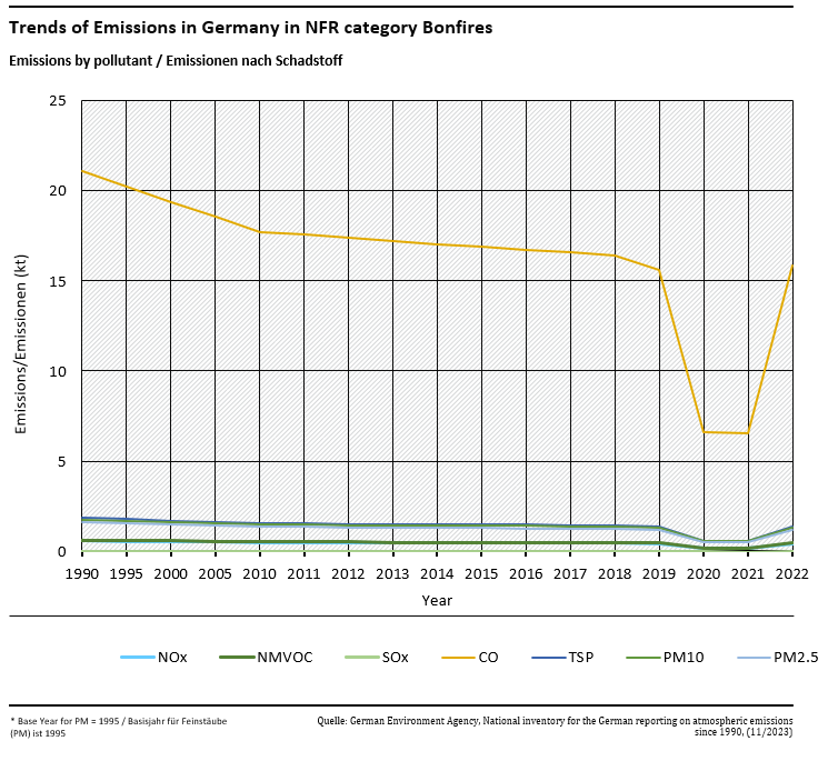 Emissions from open burning of wood and green waste for traditional purposes, so-called bonfires such as Easter fires, are reported model-based. In addition to biogenic carbon dioxide, emissions of NOx, SO2, CO, NMVOC, particulate matter (PM2.5, PM10 and TSP), Polycyclic Aromatic Hydrocarbons (PAHs) and Heavy Metals are covered so far.