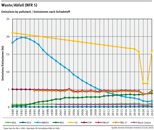 NOTE: Within category 5.C - Waste incineration, Germany only reports emissions from NFR 5.C.1.b v - Cremation and NFR 5.C.2 bonfires etc.. For all other sub-categories of NFR 5.C, as all waste incineration in Germany is carried out with energy recovery and in order to avoid double counting, resulting emissions are reported as not occuring (NO) under NFR 5.C but are included in energy sector NFR 1.